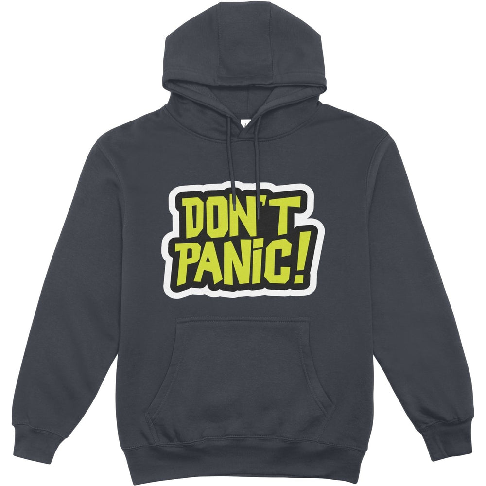 This hoodie is your essential reminder to stay calm and collected. The iconic phrase "DON'T PANIC!" jumps off the black fabric in a high-impact yellow and white outline graphic. The cartoon-style lettering gives it a fun, confident, and universally relatable vibe.