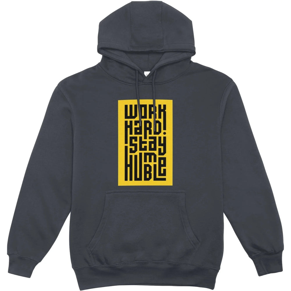 This isn't just a hoodie; it's a mantra. Featuring a bold, statement graphic, the inspiring words "WORK HARD! STAY HUMBLE" are presented in a unique, blocky font within a vibrant yellow rectangular background. The striking black text against the pop of yellow creates a powerful and stylish contrast on the classic black hoodie.