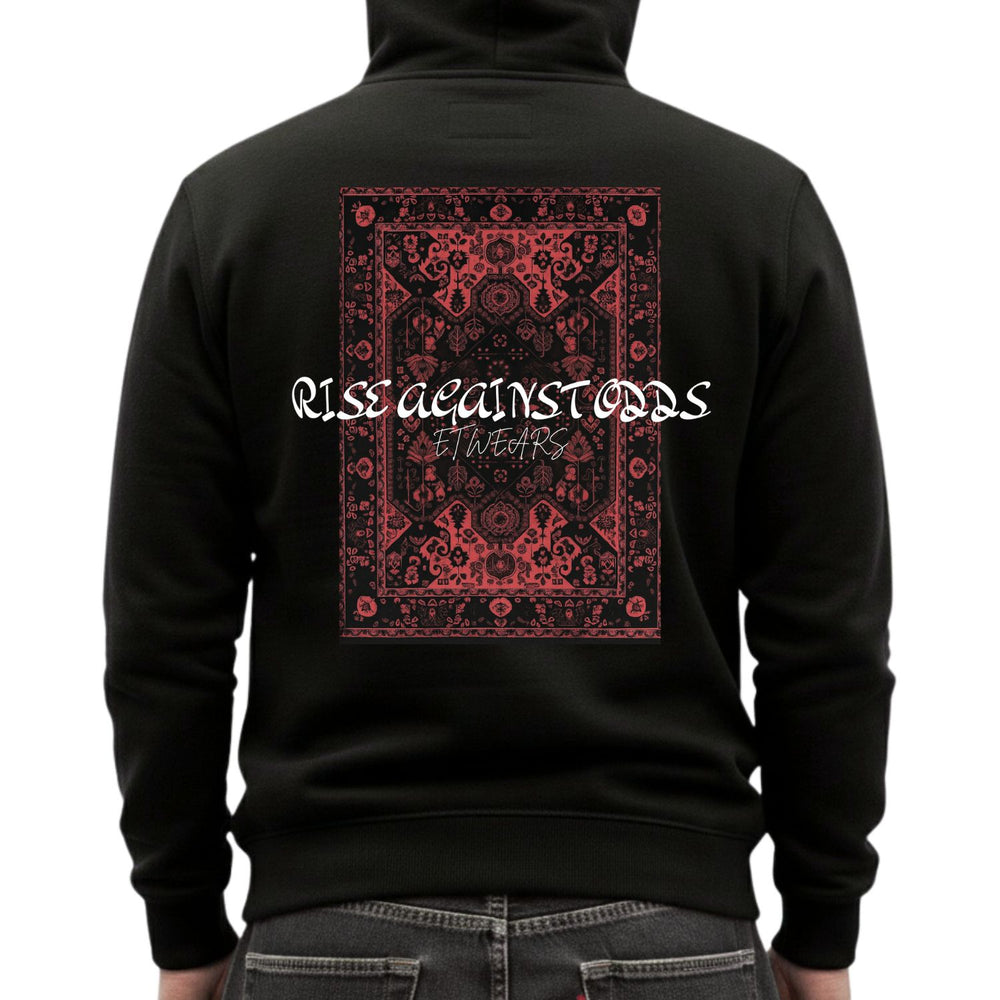 This hoodie is a testament to perseverance, featuring a large, stunning graphic on the back. The centerpiece is an intricate red and black traditional rug/tapestry pattern, lending a rich, cultural depth to the design. Superimposed on this detailed background is the motivational phrase "RISE AGAINST ODDS" in a clean, white collegiate font, with a small "ET WEARS" signature underneath.